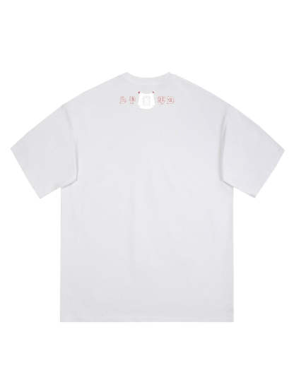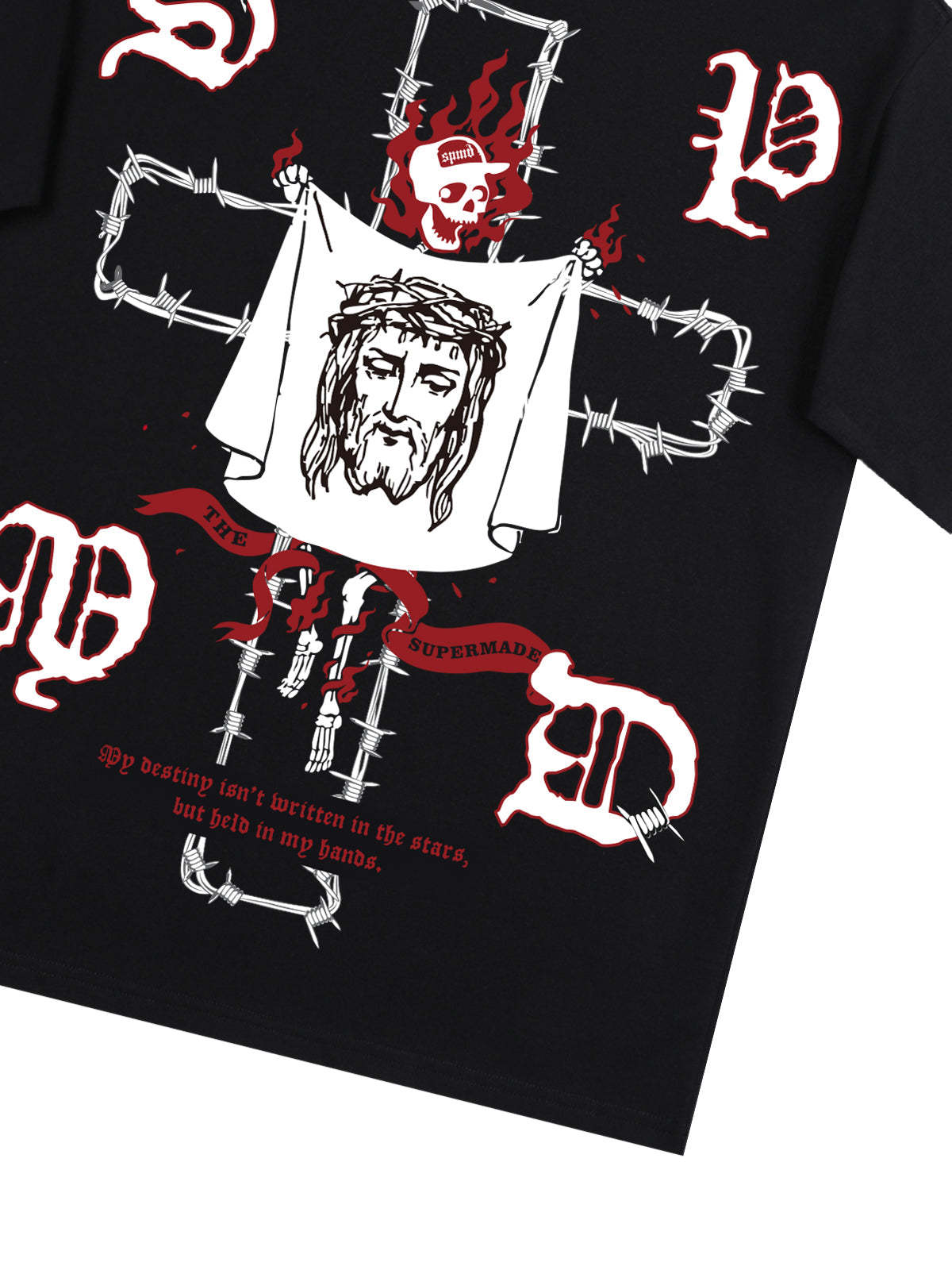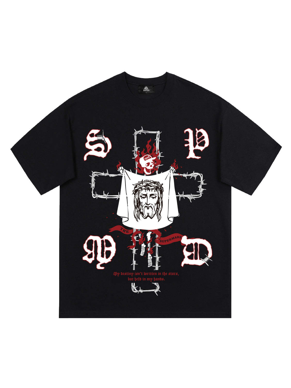 • Design Elements: Intricate graphic print featuring symbolic imagery and bold lettering